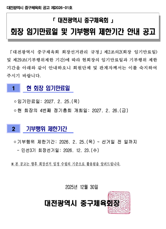 회장 임기만료일 및 기부행위 제한기간 안내 공고